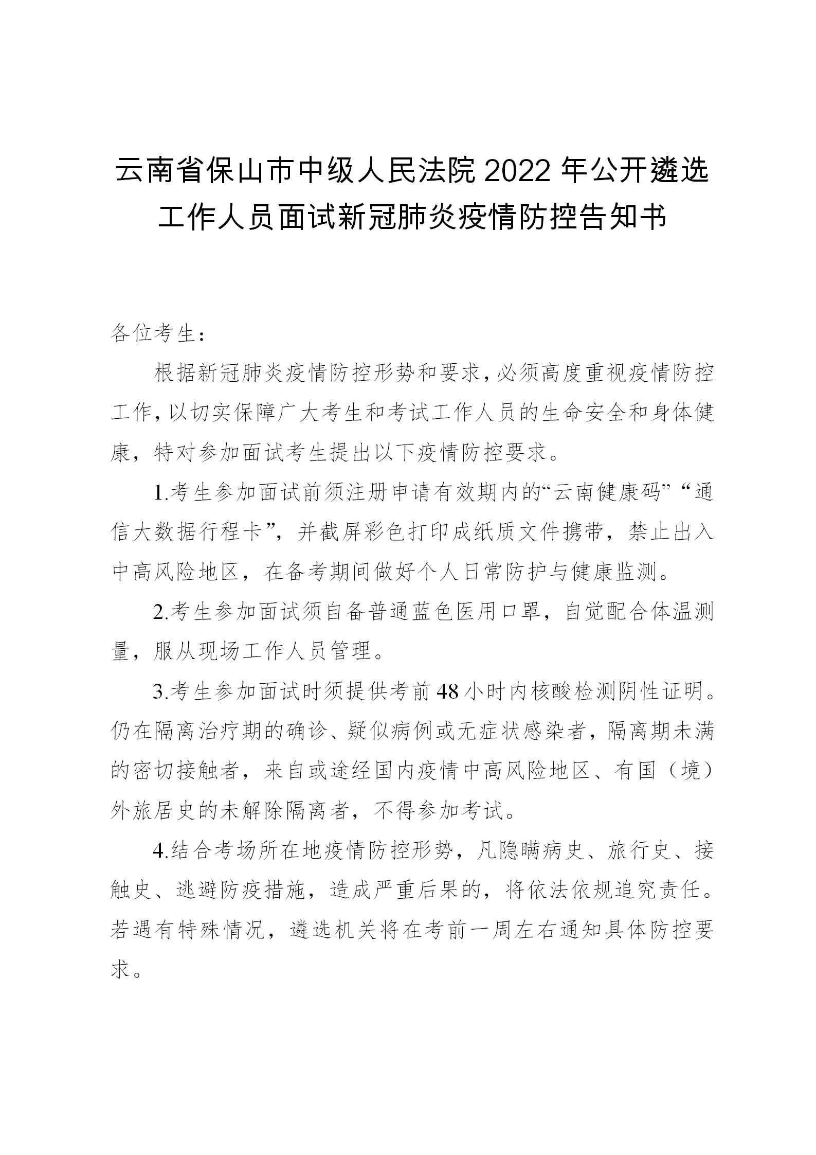 考生应佩戴一次性医用防护口罩,出具48小时内核酸检测阴性报告、彩色打印的“云南健康码”和“通信大数据行程卡”,配合进行体温测量,按照指引进入相关场所。具体要求详见《云南省保山市中级人民法院2022年公开遴选工作人员面试新冠肺炎疫情防控告知书》。