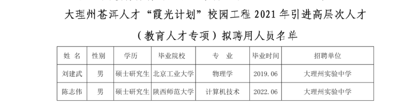 根据《大理州苍洱人才“霞光计划”校园工程2021年引进高层次人才公告》,经报名、资格复审、考试考核、体检、考察等程序,现将大理州苍洱人才“霞光计划”校园工程2021年引进高层次人才(教育人才专项)拟聘用人员予以公示。