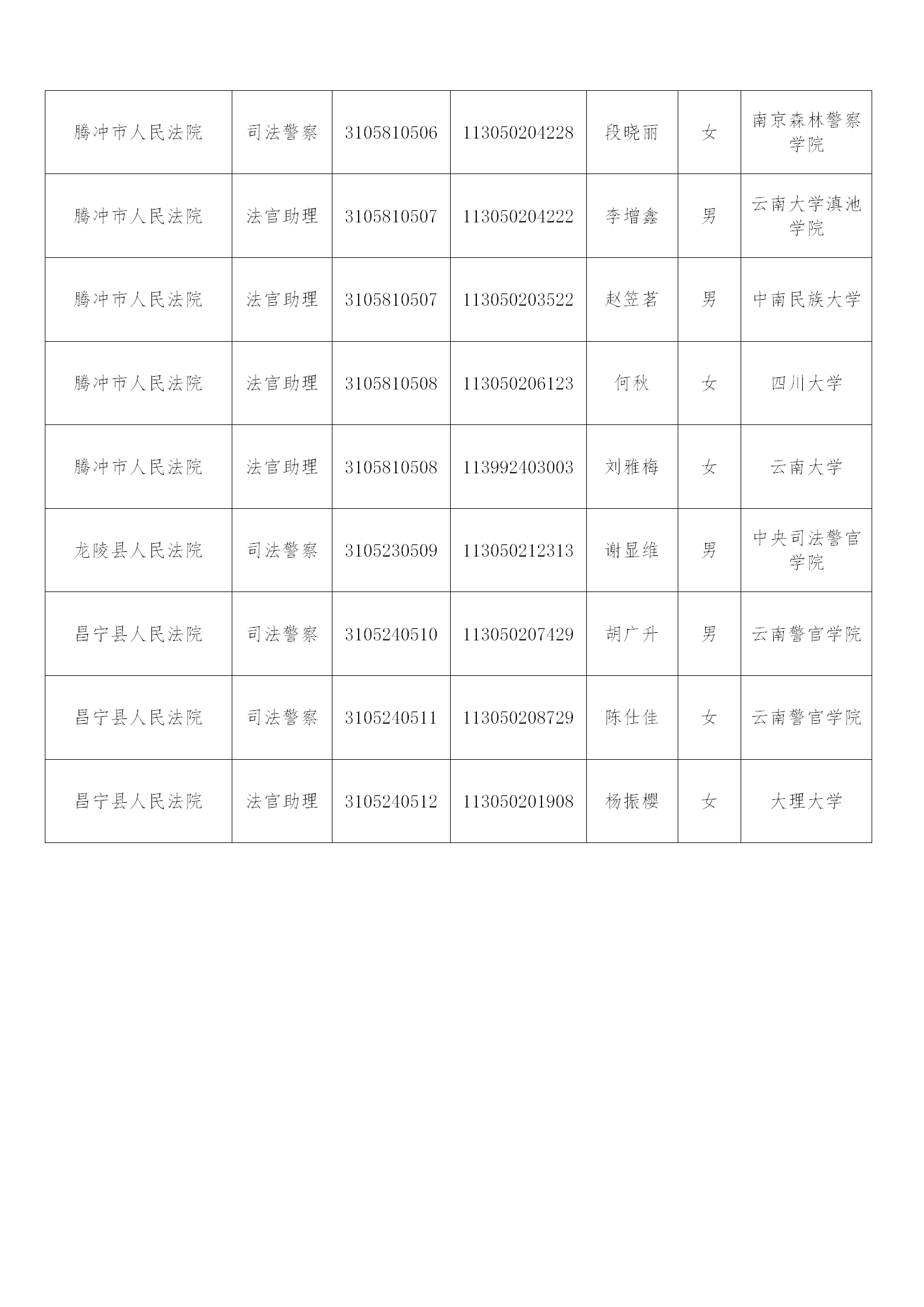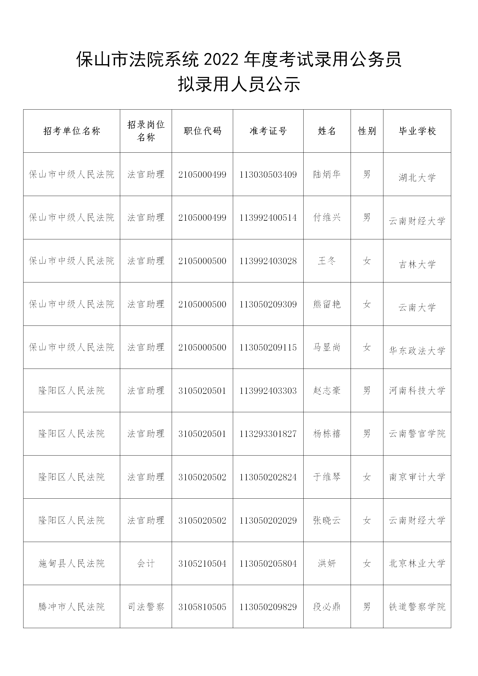 根据《中华人民共和国公务员法》《公务员录用规定》《云南省公务员录用实施办法(试行)》等规定,按照《云南省2022年度考试录用公务员公告》,经笔试、资格复审、面试、体检、考察等程序,现将保山市法院系统2022年度考试录用公务员拟录用人员予以公示,公示期为5个工作日(2022年8月11日至8月17日止)。