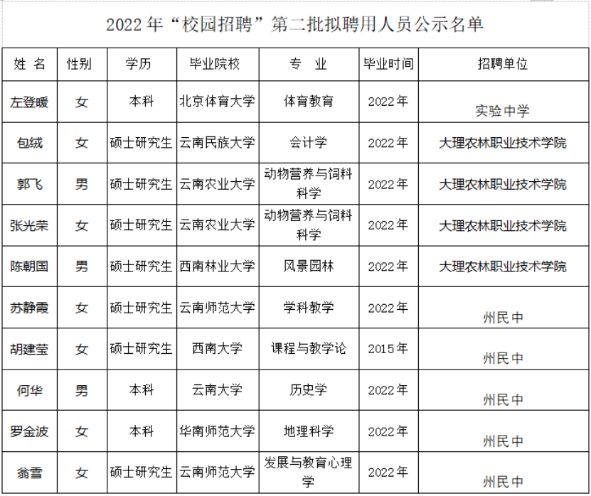 根据《大理州教育体育系统2022年“校园招聘”公告》,经报名、资格复审、考试考核、体检、考察等程序,现将大理州教育体育系统2022年“校园招聘”第二批拟聘用人员予以公示。