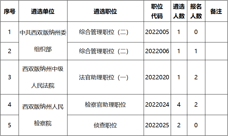 2022年西双版纳州级机关统一公开遴选公务员报名已于2022年9月8日18时结束。根据《2022年西双版纳州级机关统一公开遴选公务员公告》笔试开考比例规定,现将取消职位情况予以通告: