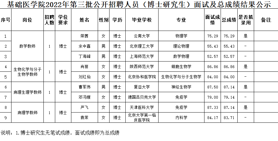 按照昆明医科大学2022年公开招聘人员面试考核工作的相关要求,我院于2022年10月13日对进入面试的应聘人员进行了学院线上面试,本着公平、公正、择优录用的原则,根据招聘岗位不同,进行了试讲以及综合素质面试,现将基础医学院2022年第三批公开招聘人员(博士研究生)面试考核结果予以公示。