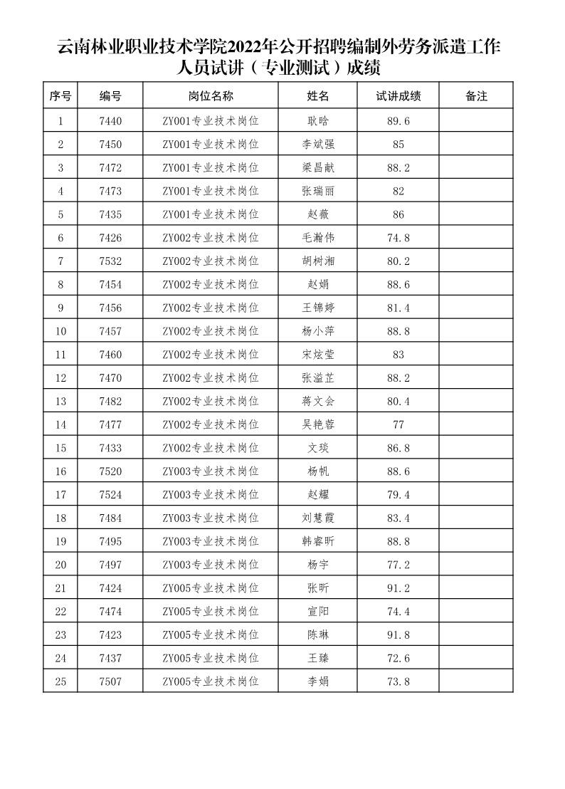 云南林业职业技术学院2022年公开招聘编制外劳务派遣工作人员试讲(专业测试)成绩