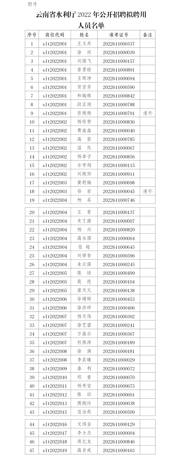 根据《云南省事业单位公开招聘工作人员办法》(云人社发〔2016〕182号)、《云南省人力资源和社会保障厅关于印发云南省事业单位公开招聘工作人员面试测评暂行办法的通知》(云人社发〔2016〕405号)有关规定,经资格审查、笔试、面试、体检和考察等程序,现将云南省水利厅2022年公开招聘拟聘用人员名单予以公示。