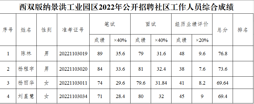 西双版纳景洪工业园区2022年公开招聘社区工作人员综合成绩公示