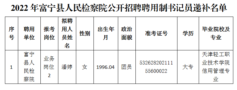 富宁县人民检察院于2021年11月面向社会公开招聘聘用制书记员,现因该岗位出现空缺,根据云南省检察机关公开招聘聘用制书记员相关规定,拟从报考我院2021年度聘用制书记员岗位的人员中按综合成绩名次从高到低等额确定递补人员,经体检、考察程序,现将1名符合递补条件的聘用制书记员予以公示。