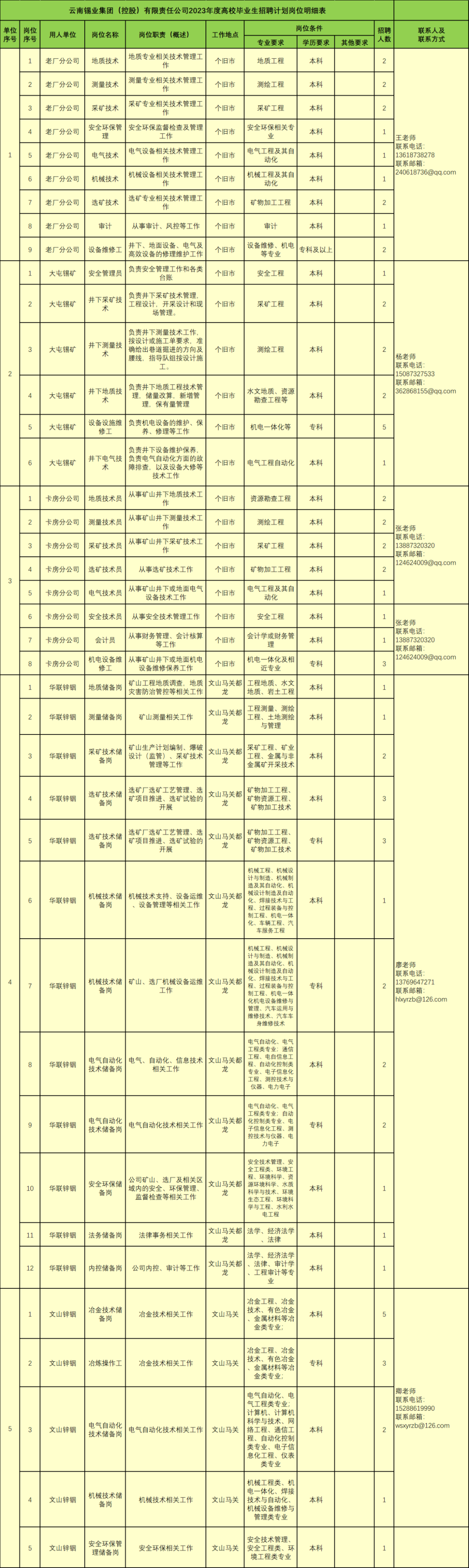 2.工作地点:昆明、个旧、文山马关、江苏苏州、广东佛山等地。