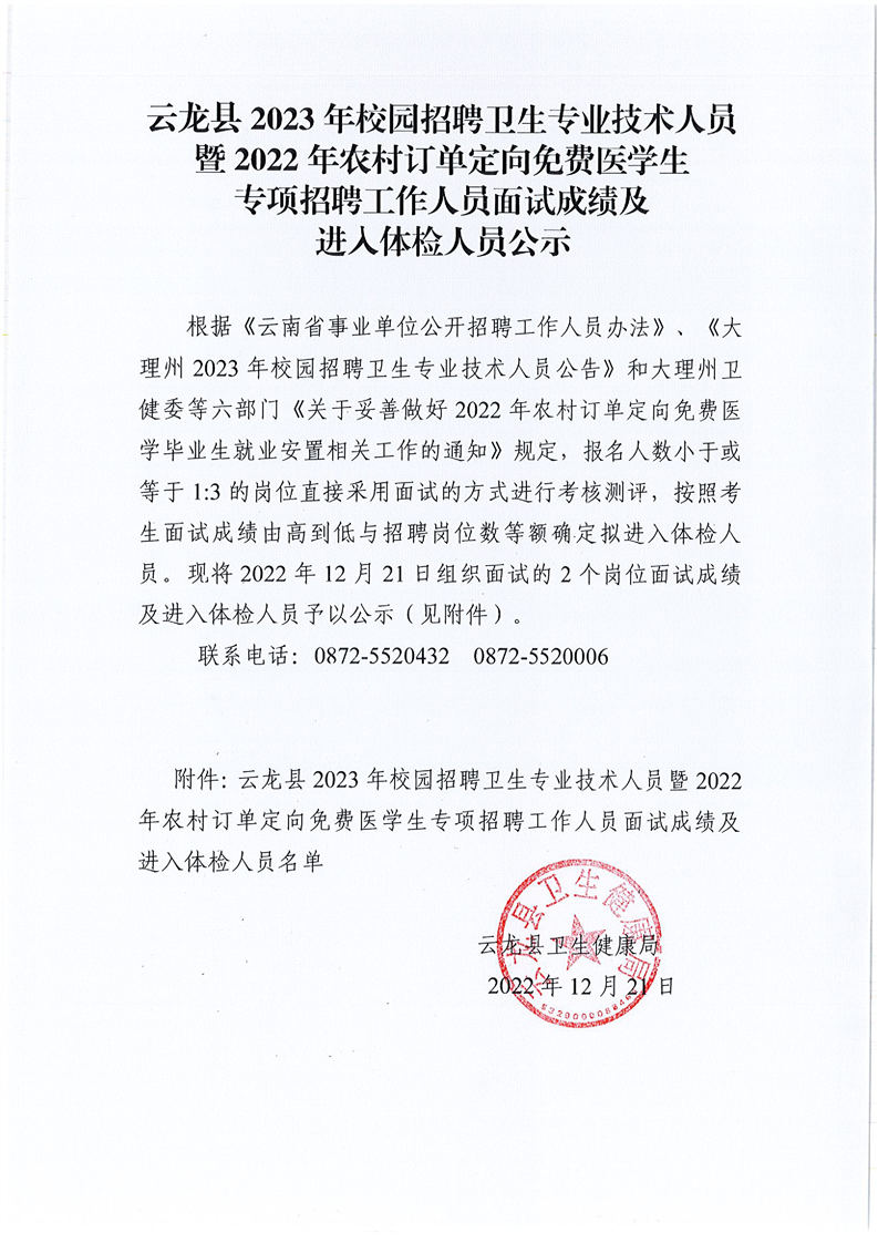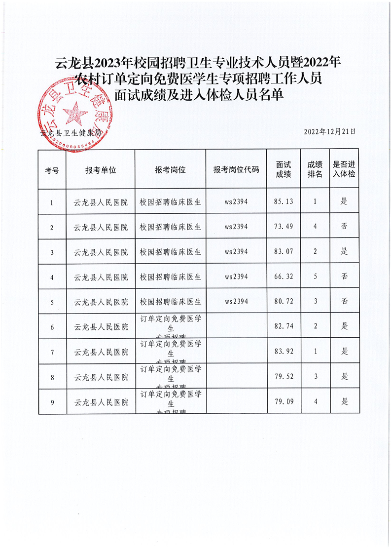 云龙县2023年校园招聘卫生专业技术人员暨2022年农村订单定向免费医学生专项招聘工作人员面试成绩及进入体检人员公示