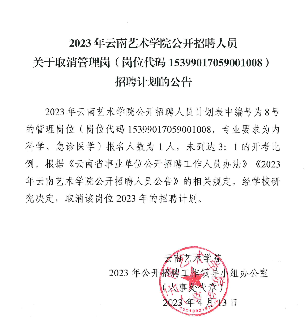 2023年云南艺术学院公开招聘人员关于取消管理岗(岗位代码15399017059001008)招聘计划的公告