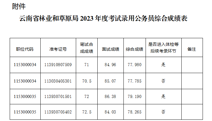 根据云南省2023年度考试录用公务员工作安排,笔试、面试工作已经结束,现将报考云南省林业和草原局下属参照管理单位工作人员考生综合成绩及后续工作安排公告如下。