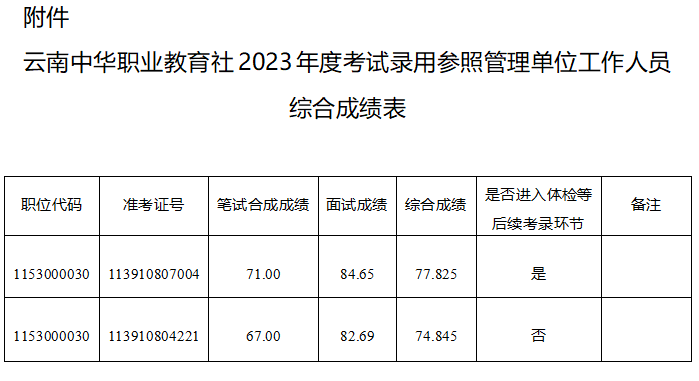 根据云南省2023年度考试录用公务员工作安排,笔试、面试工作已经结束,现将报考云南中华职业教育社参照管理单位工作人员考生综合成绩及后续工作安排公告如下。
