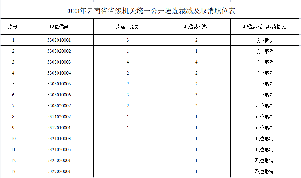 2023年云南省省级机关统一公开遴选公务员报名、资格审查、网上缴费工作已结束。按照《2023年云南省省级机关统一公开遴选公务员公告》,须对未达到开考比例的1个职位进行裁减、12个职位进行取消,详见《2023年云南省省级机关统一公开遴选裁减及取消职位表》。