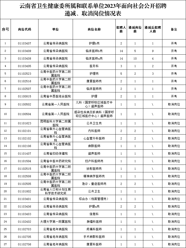 按照云南省事业单位招聘工作人员相关政策规定和《云南省卫生健康委所属和联系单位2023年面向社会公开招聘工作人员的公告》,因部分岗位报名及资格审核后未达到开考比例,现将递减、取消岗位情况进行公告。取消岗位的报考人员报名费将退回本人缴费账户。