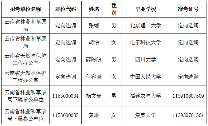 云南省林业和草原局2023年定向选调生和考试录用公务员拟录用人员名单