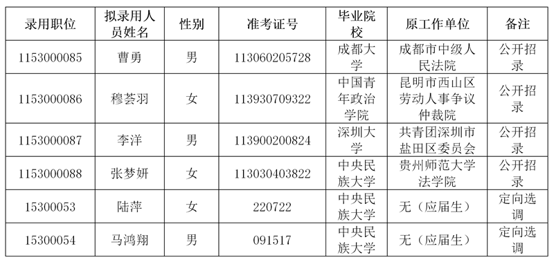根据《云南省2023年度考试录用公务员公告》及云南省面向选定高校招录2023年定向选调生等有关工作安排,经过报名、笔试、资格复审、面试、体检、考察等环节,现将云南省民族宗教事务委员会机关2023年度公务员拟录用人员公示如下: