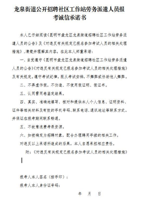 2.龙泉街道公开招聘社区工作站劳务派遣人员报考诚 信承诺书