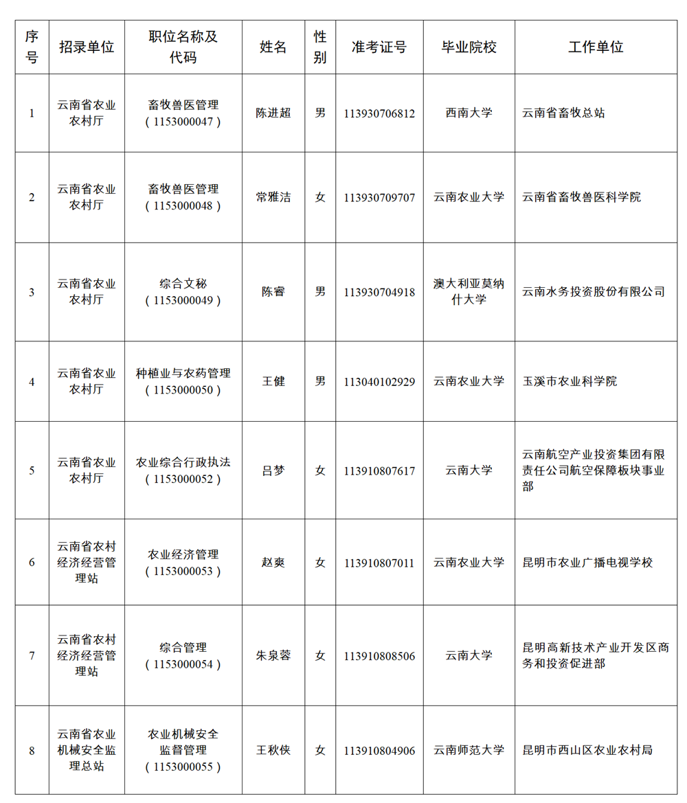云南省农业农村厅2023年度考试录用公务员拟录用人员名单