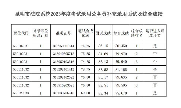 昆明市法院系统2023年度考试录用公务员补充录用面试及综合成绩