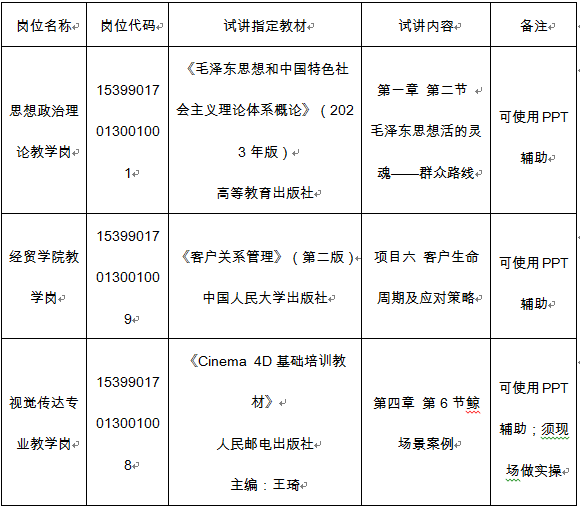 思想政治理论教学岗和经贸学院教学岗位采用“试讲+结构化面试”的方式进行测试。“试讲+结构化面试”时间20分钟(试讲15分钟,结构化面试5分钟)。