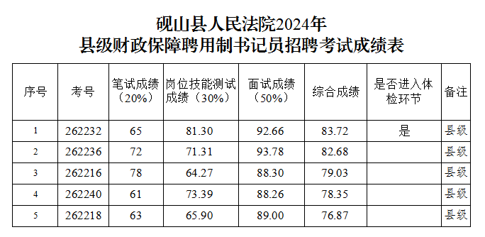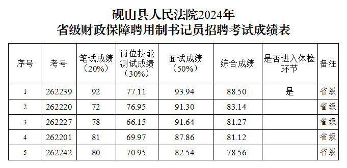 根据《砚山县人民法院2024年公开招考聘用制书记员工作方案》要求,经笔试、岗位技能测试、面试程序,现将砚山县人民法院2024年度公开招考聘用制书记员综合成绩进行公示。成绩公示时间从2024年11月22日至2024年11月26日止。若对公示成绩有异议,请电话并书面向砚山县人民法院政治部反映。反映的情况应有具体事实或证据,并签署本人真实姓名及联系电话。