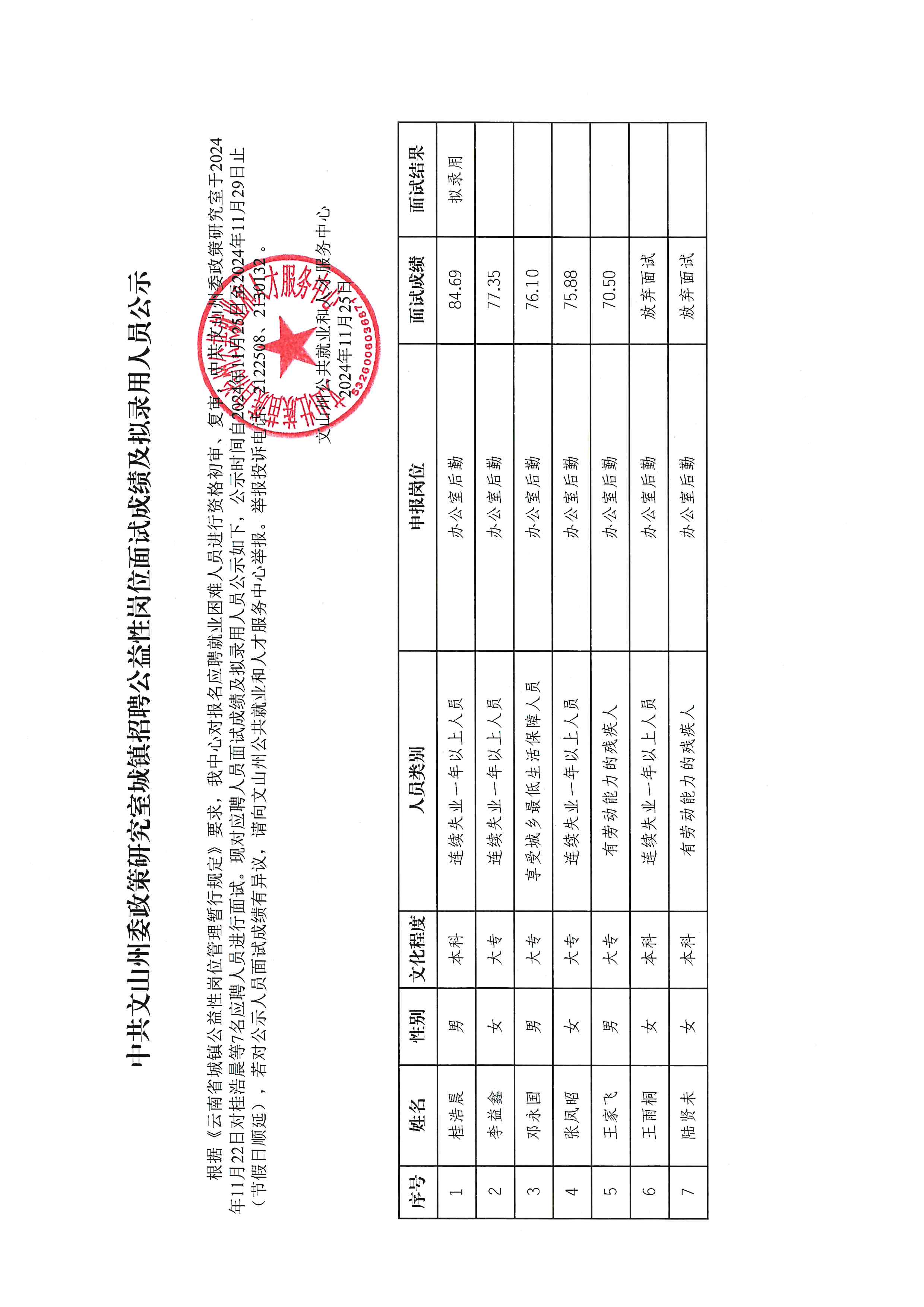 中共文山州委政策研究室城镇公益性岗位面试成绩及拟录用人员公示
