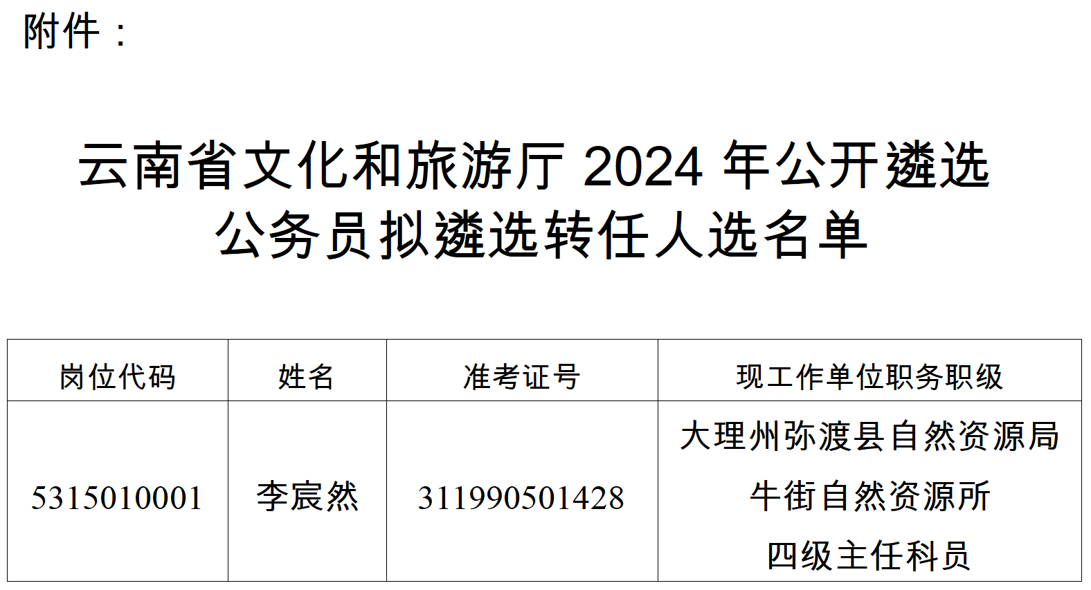 根据《2024年云南省省级机关统一公开遴选公务员工作实施方案》相关程序和规定,确定李宸然同志作为云南省文化和旅游厅2024年公开遴选公务员拟遴选转任人选(详见附件),现进行公示。