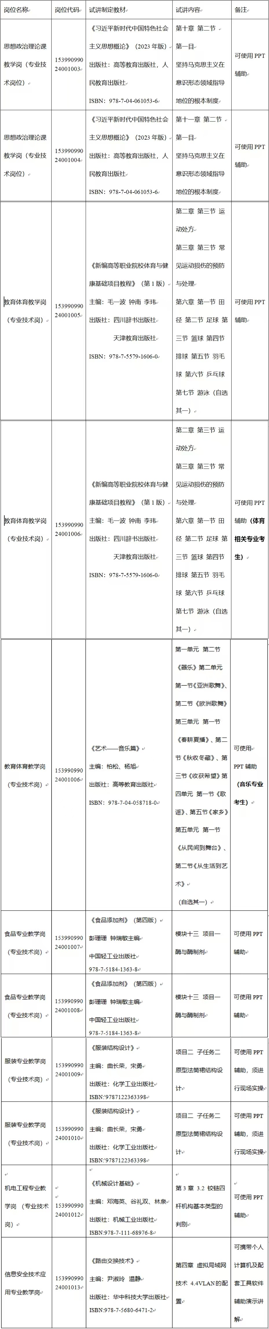 以下8个岗位采用“试讲+结构化面试”的方式进行测试,包括:15399099024001003(思想政治理论课教学岗)、15399099024001004(思想政治理论课教学岗)、教育体育教学岗(15399099024001005)、教育体育教学岗(15399099024001006)、食品专业教学岗(15399099024001007)、食品专业教学岗(15399099024001008)、机电工程专业教学岗(15399099024001012)、信息安全技术应用专业教学岗(15399099024001013)。