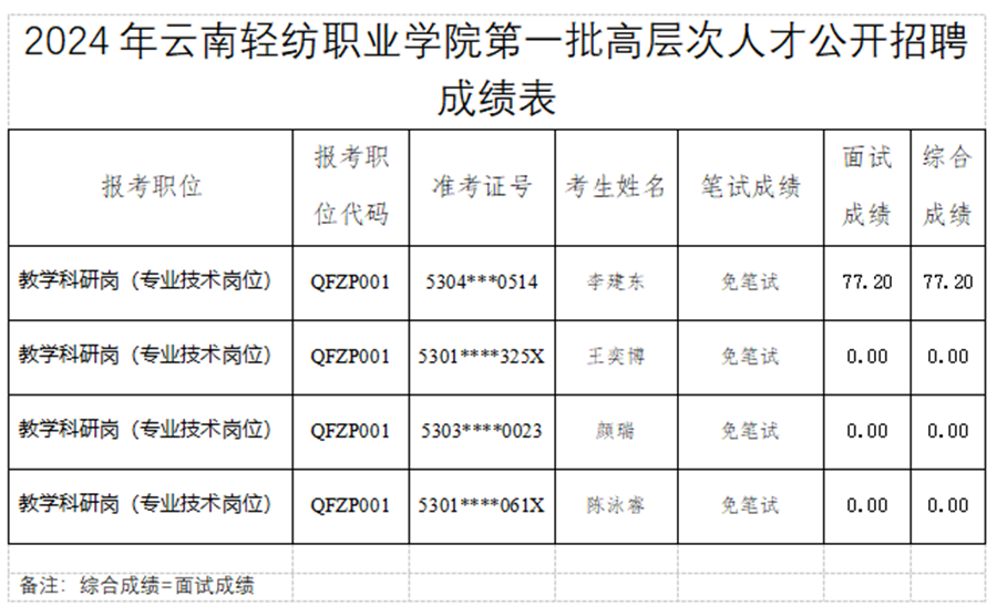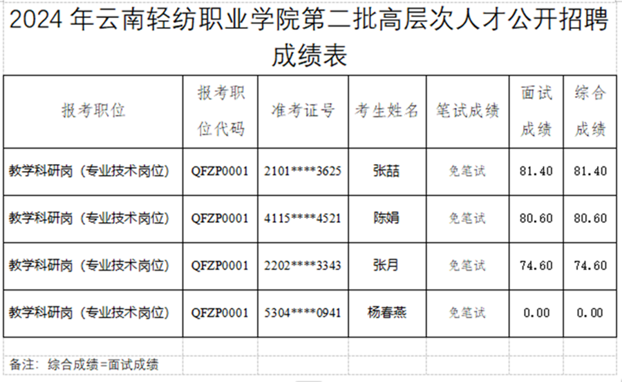 云南轻纺职业学院公开招聘于2024年12月28日完成了QFZP001、QFZP0001两个免笔试岗位的面试工作。根据《云南省事业单位公开招聘工作人员办法》(云人社发〔2016〕182号)和《2024年云南轻纺职业学院公开招聘高层次人才公告》和《2024年云南轻纺职业学院第二批公开招聘高层次人才公告》等有关规定及相关要求,现将面试成绩公告如下: