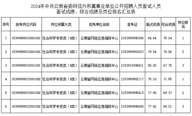 根据《云南省事业单位公开招聘工作人员办法》(云人社发〔2016〕182号)和《2024年中共云南省委网信办所属事业单位公开招聘人员公告》等有关规定,现将2024年中共云南省委网信办所属事业单位公开招聘人员面试成绩、综合成绩及岗位排名予以公布。如有疑问,请向中共云南省委网信办人事处咨询。