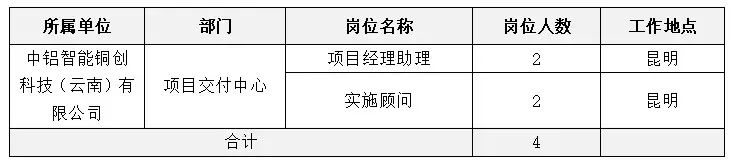 详见《中铝智能铜创科技(云南)有限公司面向社会公开招聘岗位一览表》(附件1)。