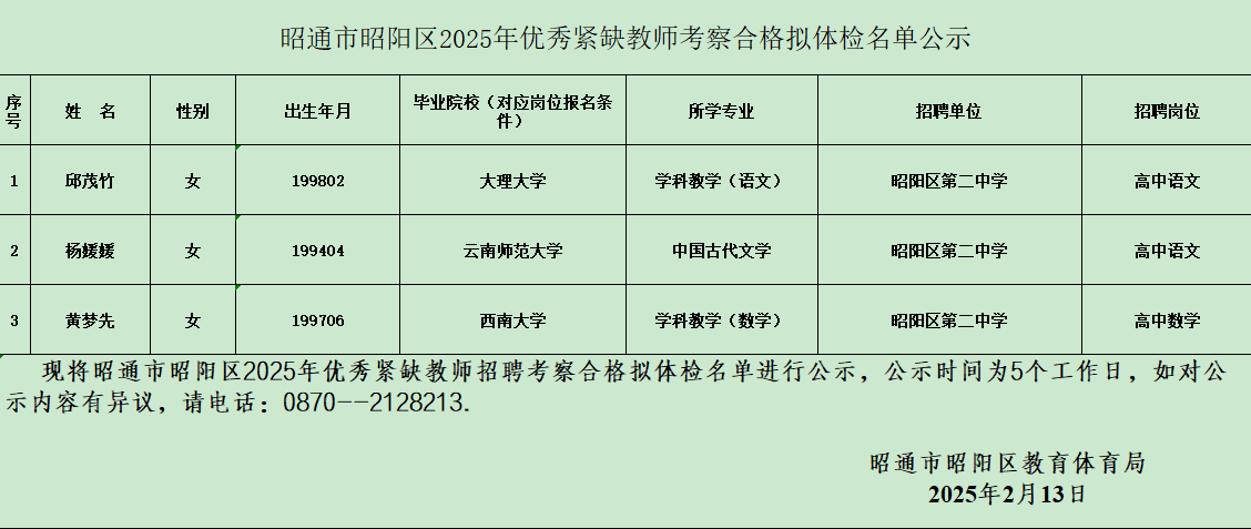 昭通市昭阳区2025年优秀紧缺教师考察合格拟体检名单公示
