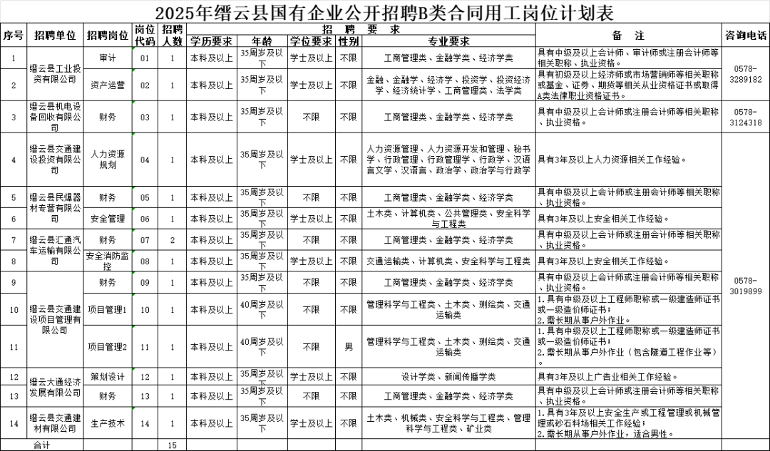 2025年全县部分国有企业计划公开招聘B类合同用工15名,具体的招考单位、对象、岗位、人数和报考资格等详见《2025年缙云县国有企业公开招聘B类合同用工岗位计划表》(附件)。