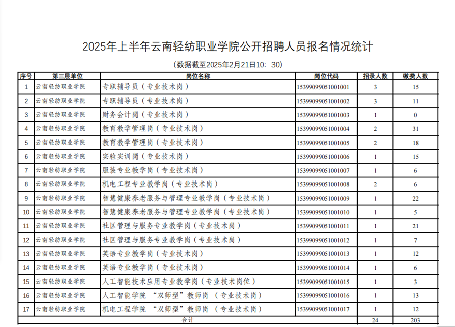 2025年上半年云南轻纺职业学院公开招聘人员报名情况统计(数据截至2025年2月21日10:30)