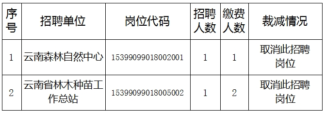 根据《2025年云南省林业和草原局事业单位公开招聘人员公告》,对实际缴费人数与计划招聘人数比例未达到3:1的招聘岗位予以取消或相应递减招聘人数,截至2025年2月23日缴费结束,结合各岗位实际报名缴费情况,现将岗位裁减情况公告如下: