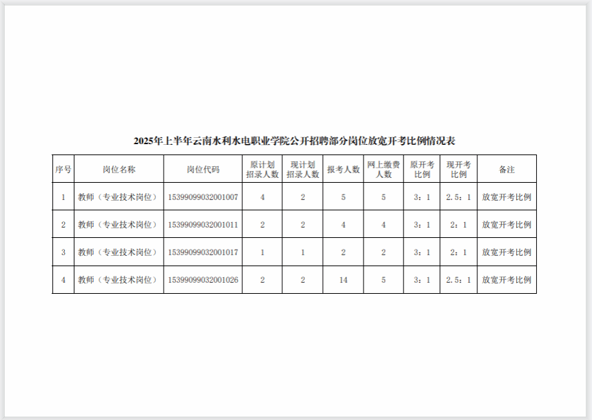 根据《2025年上半年云南水利水电职业学院公开招聘人员公告》,经云南省教育厅、云南省人力资源和社会保障厅批准,现将部分岗位放宽开考比例情况公告如下:
