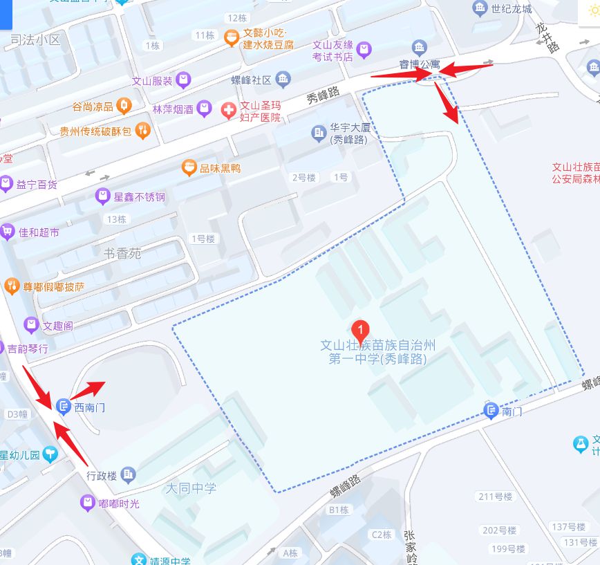 (一)文山州第一中学。考点地址:文山市开化街道秀峰路158号,乘坐1路、9路、10路公交车可达,地图链接:https://j.map.baidu.com/e5/vC5,位置图如下: