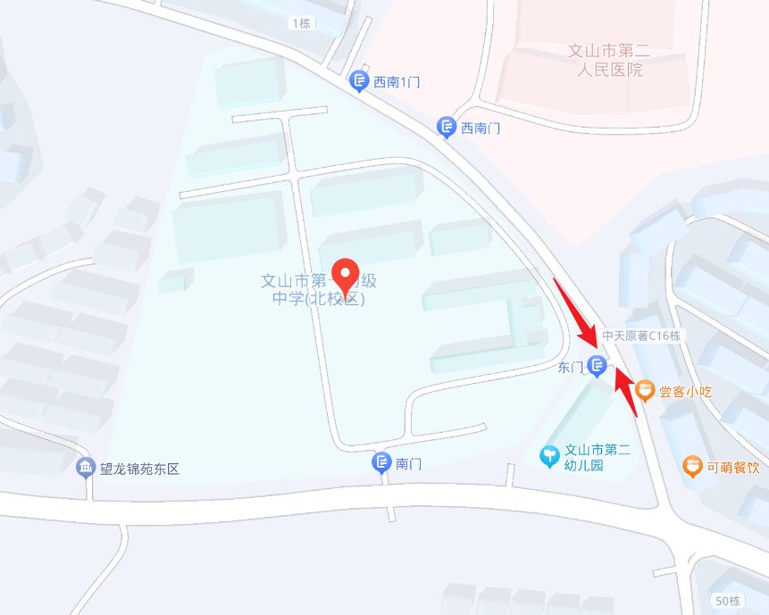 (四)文山市第一初级中学北校区。考点地址:文山市卧龙街道登科路8号,乘坐12路公交车可达,地图链接:https://j.map.baidu.com/c5/H-C,位置图如下:
