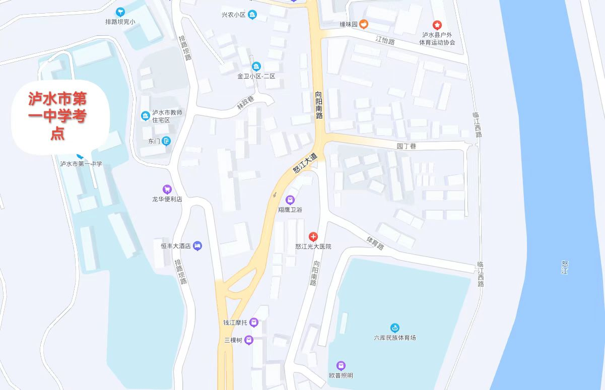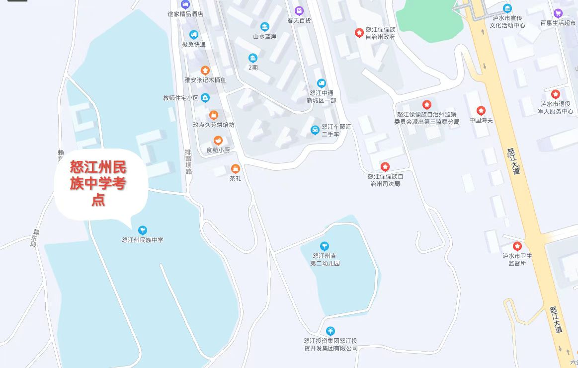 怒江考区共设有怒江州民族中学、泸水市第一中学、泸水市第一完全小学3个考点。考点学校具体地址及地图指南如下: