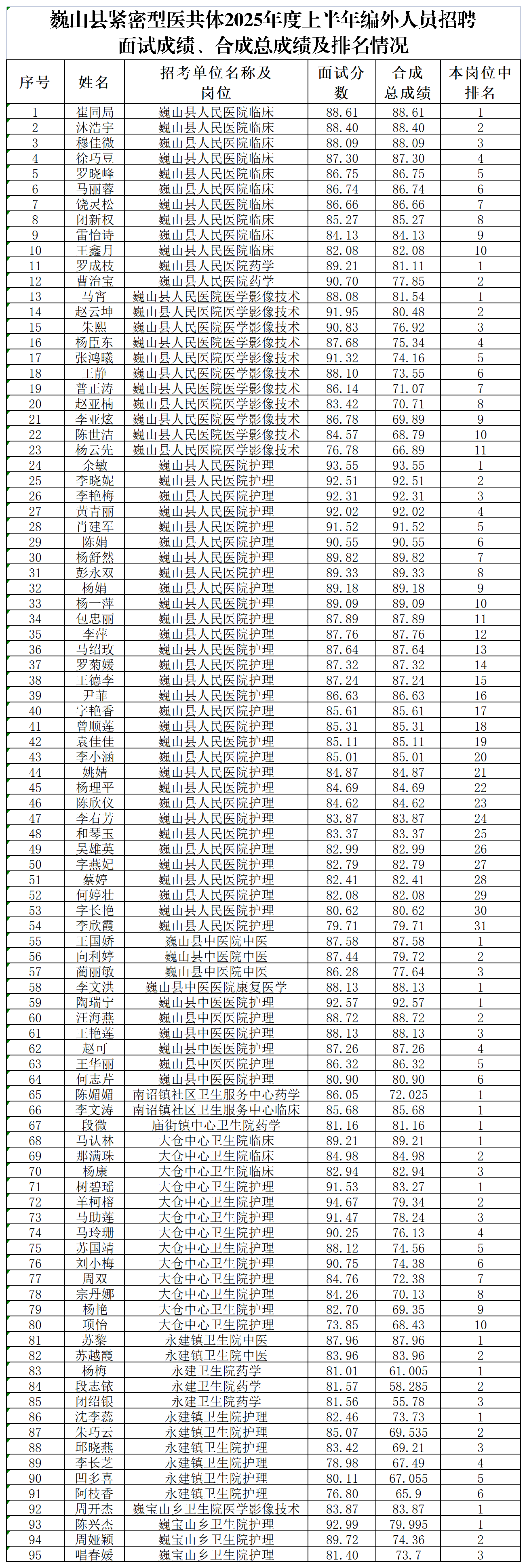 附件:1.巍山县紧密型医共体2025年度上半年编外招聘面试成绩、合成成绩及排名情况