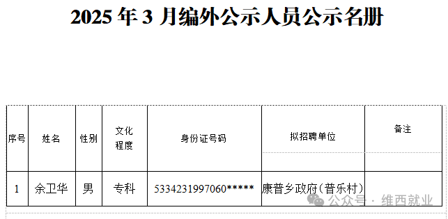 根据用人单位申请,按照相关程序向社会公开招聘,拟招聘余卫华同志为机关事业单位编外工作人员。现予以公示(名单附后),公示期为五个工作日,如有异议,请在公示期内向维西县人力资源市场反映,在公示期内如无异议,将给予聘用。