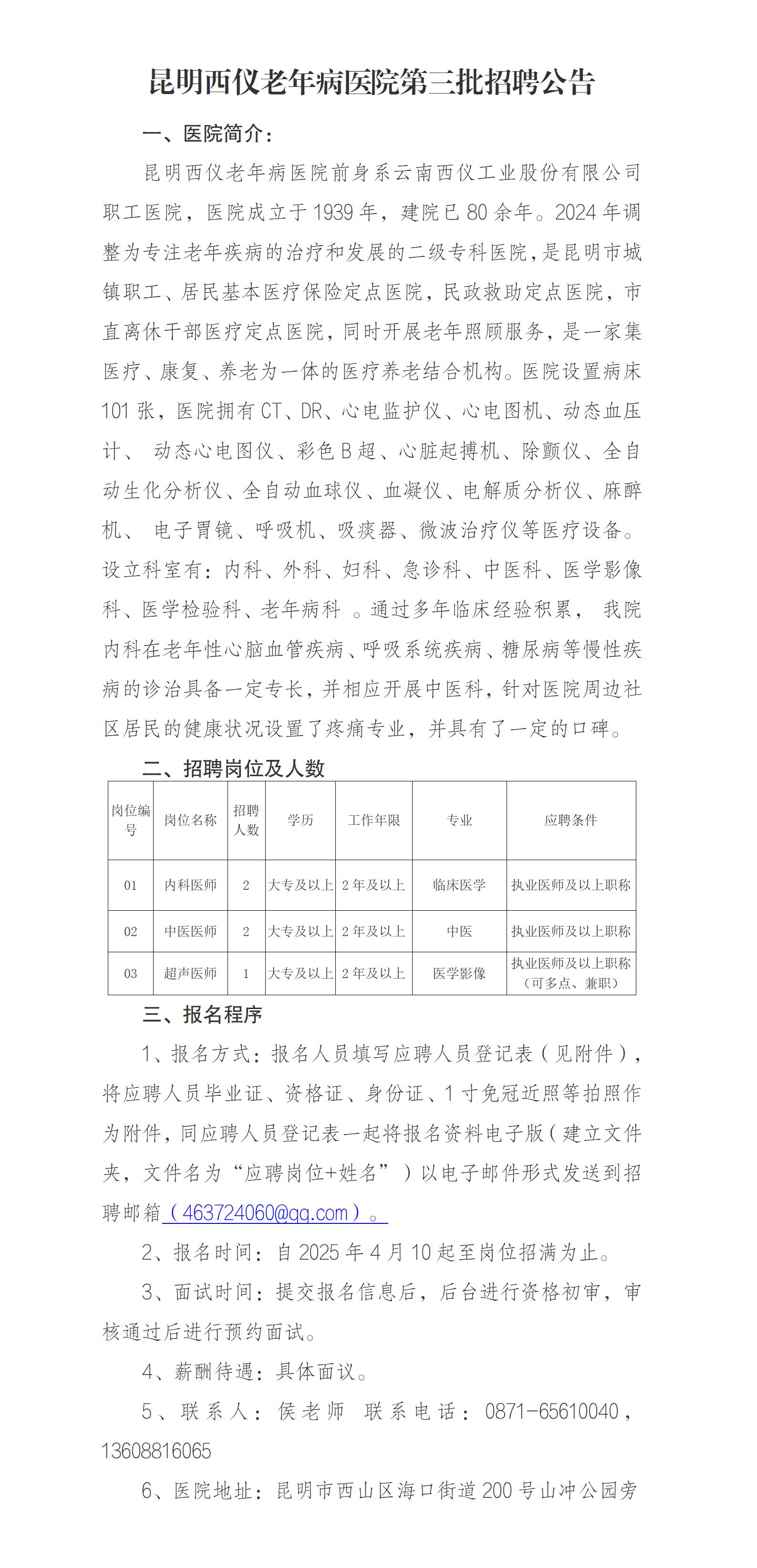已结束 【合同制】昆明西仪老年病医院第三批招聘公告(招若干人,04月10日~04月25日报名)