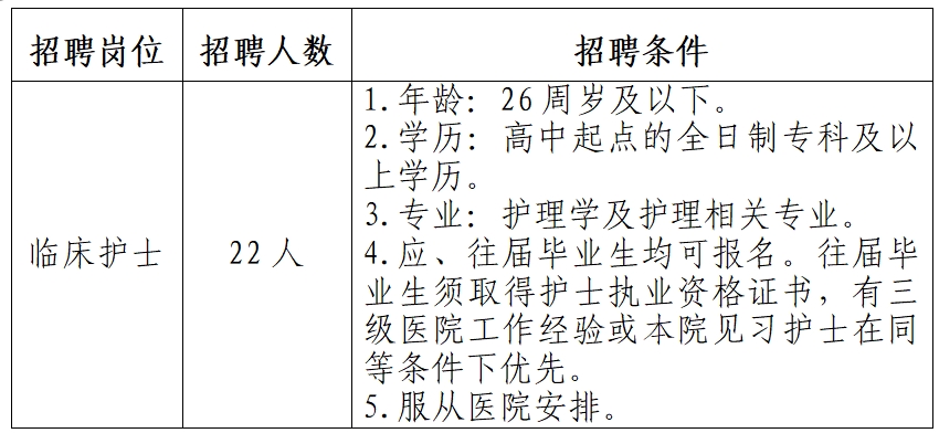 根据医院业务发展需求,现需招聘护理人员22名,具体招聘条件如下: