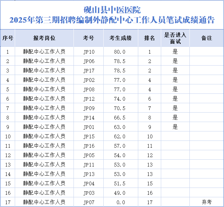 根据笔试成绩由高分到低分,按照招聘人数与面试人数1:3的比例确定面试人选,最终确定9名进入面试。面试时间及地点:2025年4月11日8:30在砚山县中医医院医技楼四楼会议室进行面试,8:00到场签到并抽取面试顺序,迟到15分钟取消面试资格。