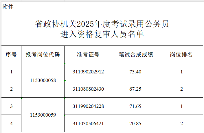 在达到笔试合格分数线的报考者中,按不超过录用计划数2倍的比例和笔试合成成绩由高到低的顺序,以2:1的比例确定各职位参加资格复审人员(详见《省政协机关2025年度考试录用公务员进入资格复审人员名单》)。
