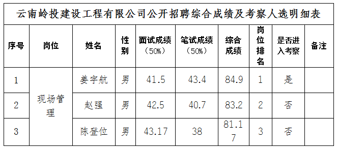 秉承公平、公正、公开招聘原则,云南岭投建设工程有限公司根据《云南岭投建设工程有限公司关于面向社会公开招聘工作人员的公告》流程,本次招聘面试环节已结束,现将面试人员综合成绩及考察人选公示如下: