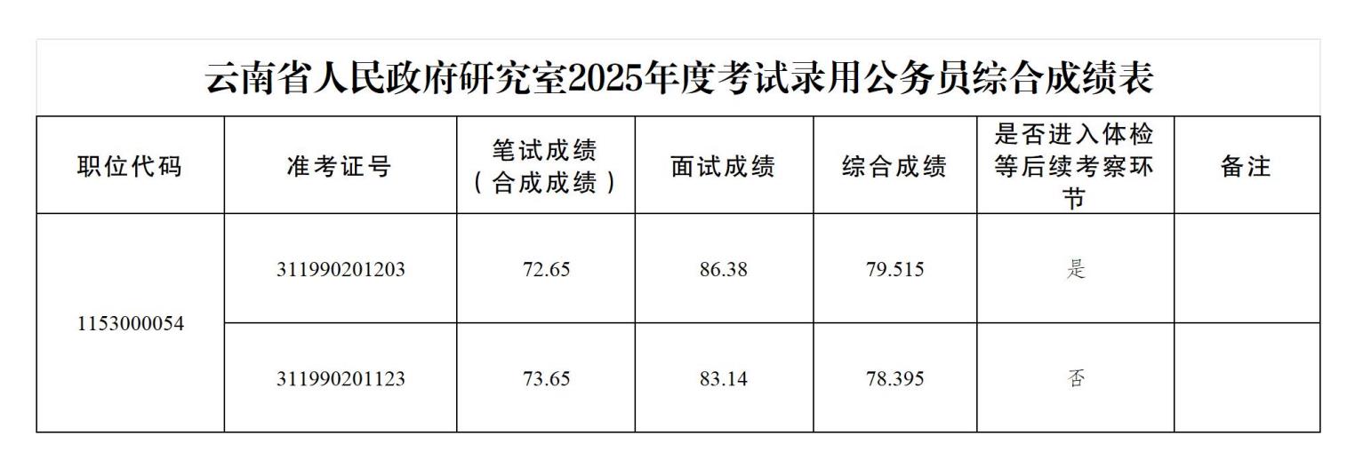 根据云南省2025年度考试录用公务员工作安排,笔试、面试工作已经结束,现将报考云南省人民政府研究室公务员考生综合成绩及后续工作安排公告如下。