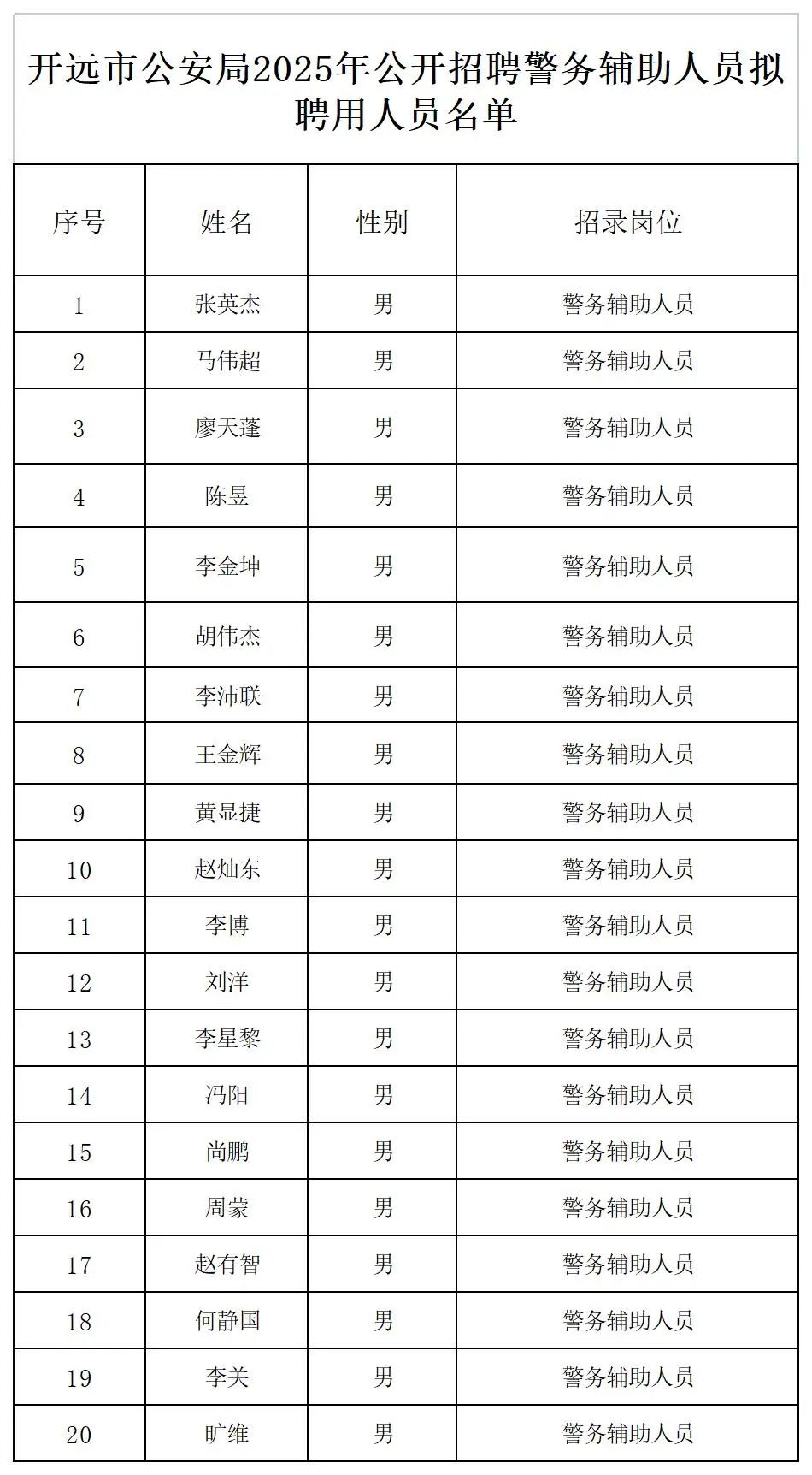 根据《开远市公安局警务辅助人员招聘公告》,遵循“公开、公平、竞争、择优”的招录原则,经报名、资格审查、笔试、面试、体能测试、政审、体检各环节后确定拟聘用人员20名,现予公示:
