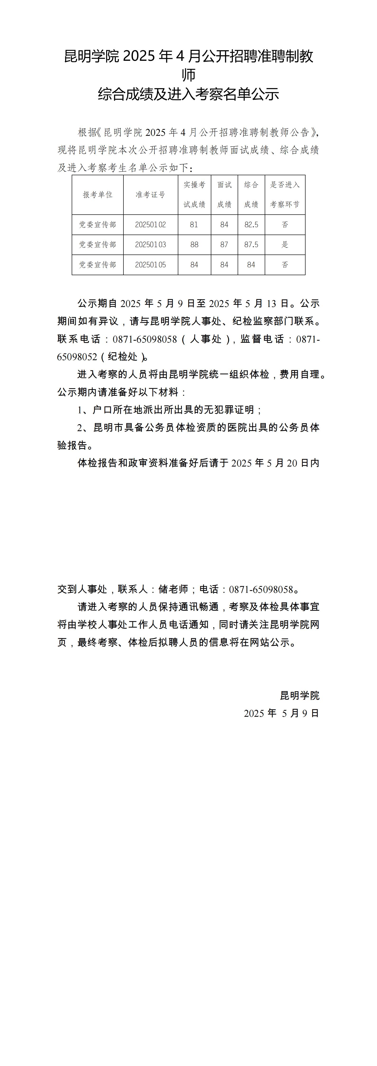 昆明学院2025年4月公开招聘准聘制教师综合成绩及进入考察名单公示
