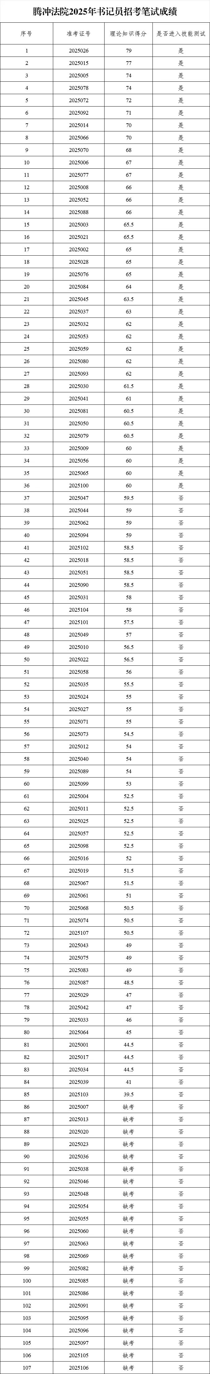 注:考生如对笔试成绩有疑问,可到腾冲市人民法院710办公室核查。