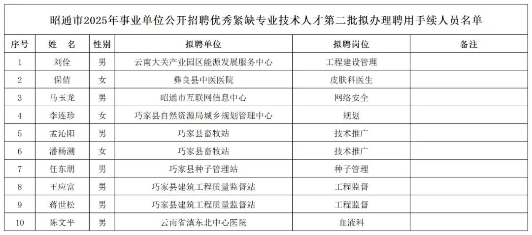 昭通市2025年事业单位公开招聘优秀紧缺专业技术人才第二批拟办理聘用手续人员名单